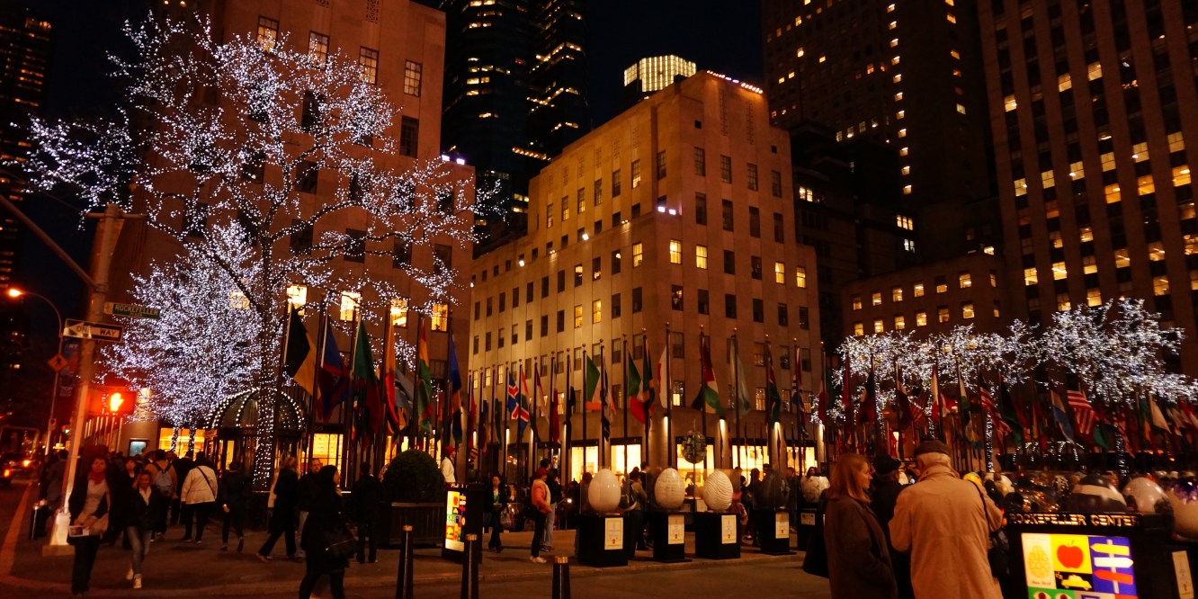 Et voici enfin quelques photos du Rockfeller Center où je suis retournée ce soir exprès pour ça ! Alors pour résumer, le Rockfeller est un grand building de New York, d’où on peut avoir une magnifique vue, parait-il, et à son pied, se trouve une grande place avec une patinoire en hiver (enfin jusque début avril), et plusieurs magasins spéciaux, comme la boutique Lego ou la boutique Nintendo. C’est aussi là, que se trouve le grand marché de Noël de New York qui est vraiment superbe apparemment.