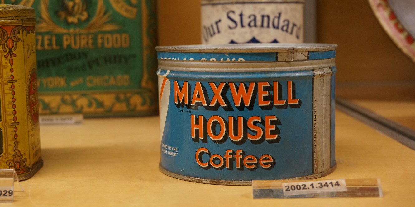 Ensuite, je suis tombée sur une collection d’objets utilisés pour le commerce, comme des boites en métal, des flacons de médicaments, etc. On retrouve alors les Etats-Unis du début du XIX mais également les Etats-Unis, pays de la consommation des années 50.