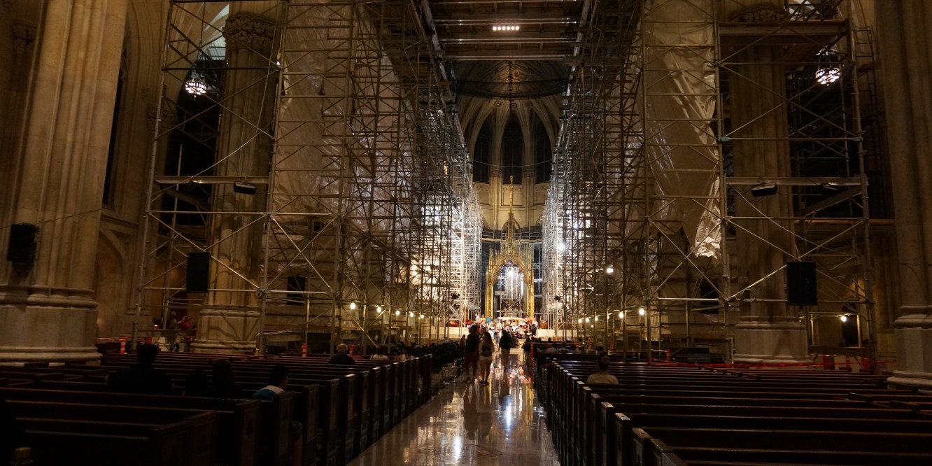 De plus, il y avait une chorale qui répétait et qui emplissait de vie ses hautes colonnes et les barres métalliques des échafaudages qui faisaient presque partie de la pierre. Ca faisait du bien de se retrouver là après l’agitation de la rue et de la vie à NY en général ! Je me suis assise et j’ai respiré un grand coup. Sinon, cette cathédral est quand même quelque chose. Apparemment, c’est l’une des plus grandes de NY et elle y a vu les funérailles de Kennedy par exemple et d’autres personnes connues dont je ne me souviens plus le nom. L’intérieur est plutôt simple mais plutôt lumineux, dans les tons blancs et beiges, ce qui lui donne un aspect doux et chaleureux. Pas de fioritures, des bancs en bois tout simple, pas de dorure, etc..