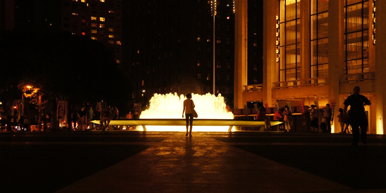 En sortant du musée, nous nous sommes promené autour du Lincoln Center, ce grand centre d’art dramatique, de danse, de spectacle… La journée, il s’agit d’une place très sympa, peuplée de familles, de vendeurs de glaces, de touristes. La nuit, elle revêt son 31 et prend un tout autre aspect ! Ses façades et fontaines sont éclairées d’une magnifique lumière dorée qui fait scintiller chaque fenêtre et chaque goutte d’eau. C’est un endroit magnifique dans lequel on imagine très bien les spectateurs habillés de leur plus beau costume/robe sortir prendre une coupe lors d’un entracte…